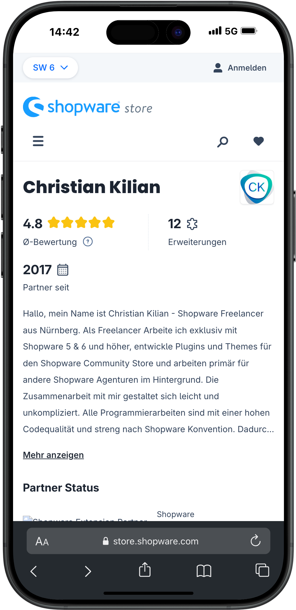 Als zertifizierter Shopware Developer und offizieller Plugin-Hersteller finden Sie meine Erweiterungen direkt im Shopware Store. Dort biete ich sowohl kostenlose als auch kostenpflichtige Plugins an – entwickelt für maximale Kompatibilität und einfache Integration.